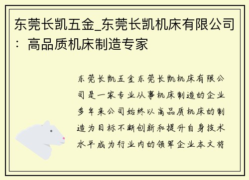 东莞长凯五金_东莞长凯机床有限公司是一家专业从事机床制造的企业。多年来,公司始终以高品质机床的制造为目标,不断创新和提升自身技术水平,成为行业内的领军企业。本文将从8个方面对东莞长凯五金_东莞长凯机床有限公司进行详细阐述。